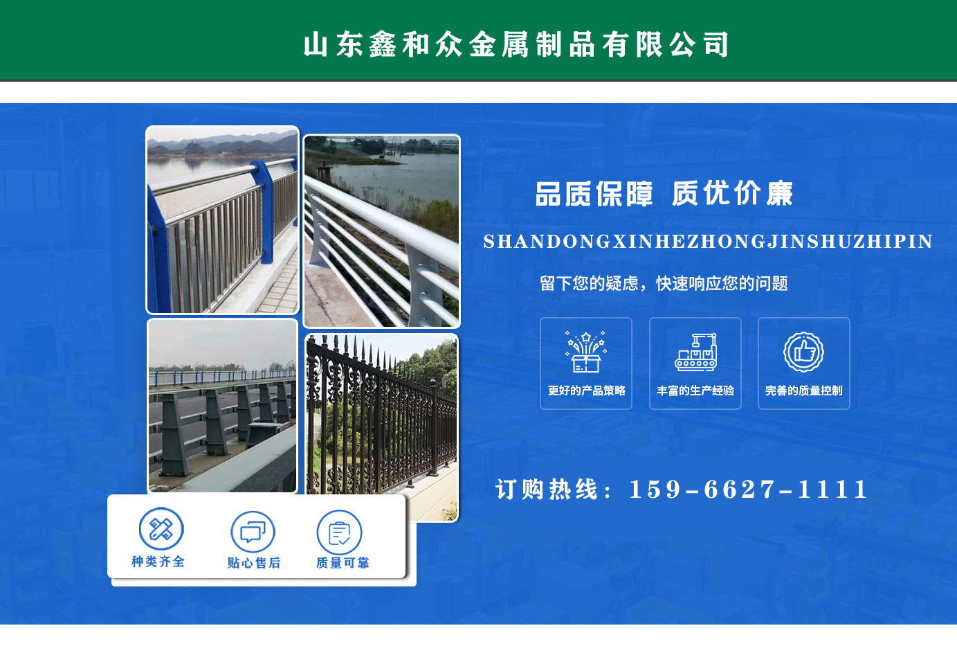 山東鑫和眾金屬制品有限公司主要產(chǎn)品有防撞護(hù)欄,橋梁護(hù)欄,道路護(hù)欄,河道護(hù)欄,不銹鋼護(hù)欄等護(hù)欄。提供設(shè)計(jì)方案,一站式定制,包您滿意價(jià)格優(yōu)惠,歡迎來電咨詢! 公司常年從事銷售護(hù)欄防撞護(hù)欄,橋梁護(hù)欄,道路護(hù)欄,河道護(hù)欄,不銹鋼護(hù)欄,橋梁鋼護(hù)欄,河道燈光護(hù)欄等。產(chǎn)品廣泛應(yīng)用于橋梁、河道、旅游景區(qū)、道路、公路、公園、小區(qū)、景觀、道路防撞等領(lǐng)域。 公司產(chǎn)品均采用優(yōu)質(zhì)不銹鋼材料,符合相關(guān)標(biāo)準(zhǔn)。各種型號(hào)不銹鋼復(fù)合管及護(hù)欄,質(zhì)量嚴(yán)格把控。產(chǎn)品強(qiáng)度高、耐腐蝕、焊接牢固、抗沖擊、性能好,防撞護(hù)欄結(jié)構(gòu)簡(jiǎn)單、美觀實(shí)用大方?! g迎前來訂購(gòu)!...